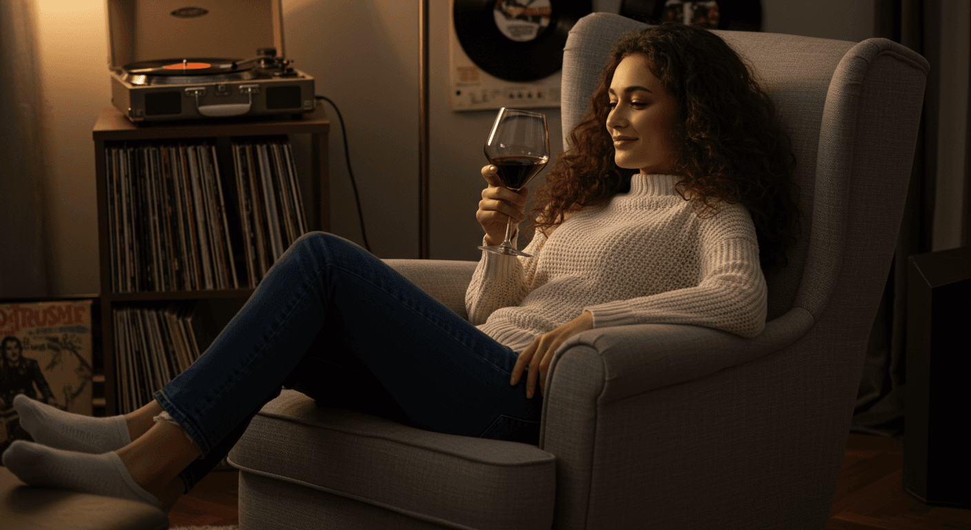 Jemand entspannt sich in einem bequemen Sessel, hört Musik bei einem Glas Wein, mit Vinyl im Hintergrund
